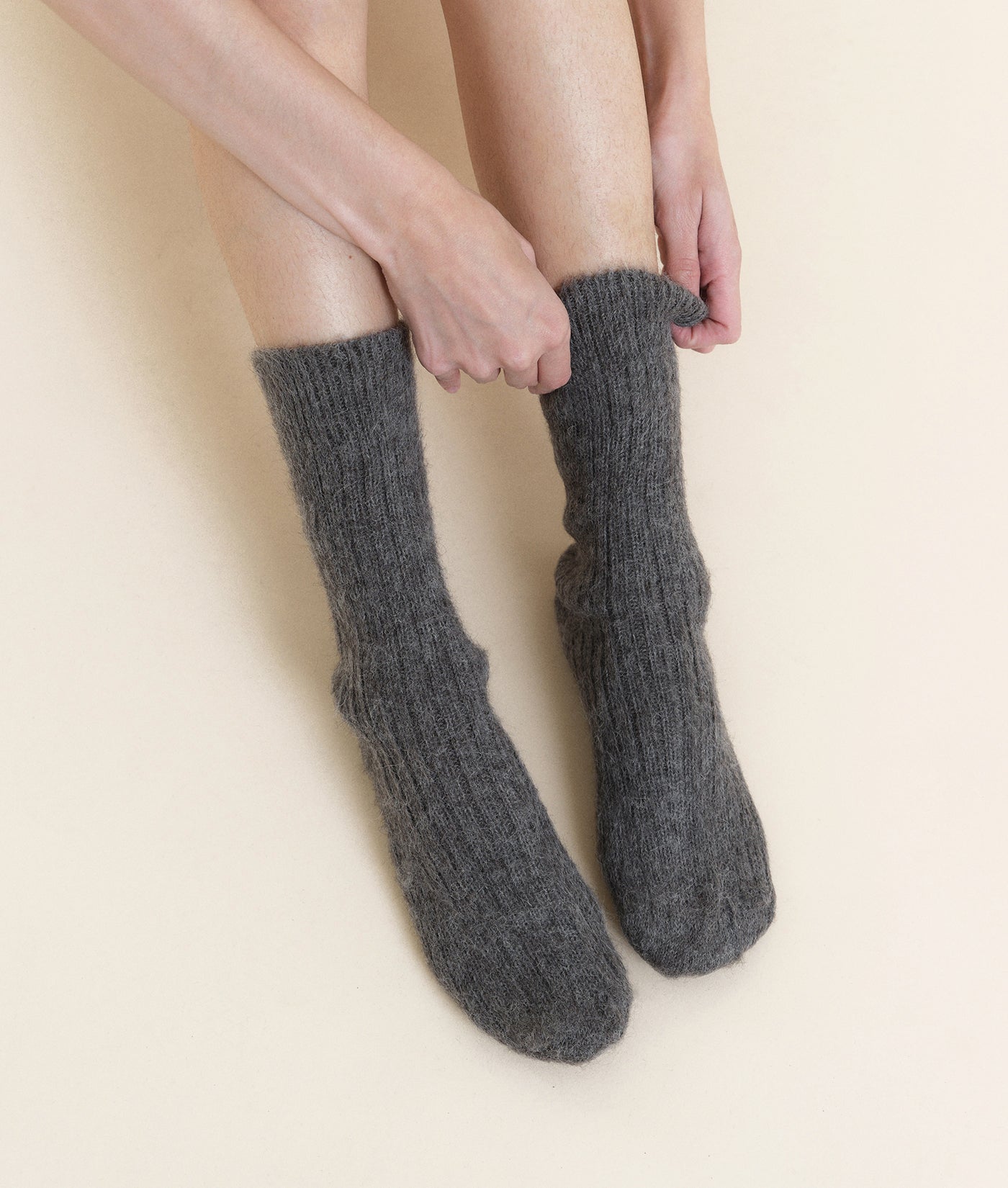 IOAN Alpaca Cabin Socks are made from 100% alpaca wool by a Bolivian co-op of farmers, manufacturers, and knitters. The production of these ultra soft and cozy socks supports the local lifestyles, craftsmanship, and the future of this community. The sustainable process of only using virgin fibers in their undyed state reduces pollution, conserves resources, and allows the natural qualities of the materials to be appreciated for what they are.