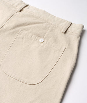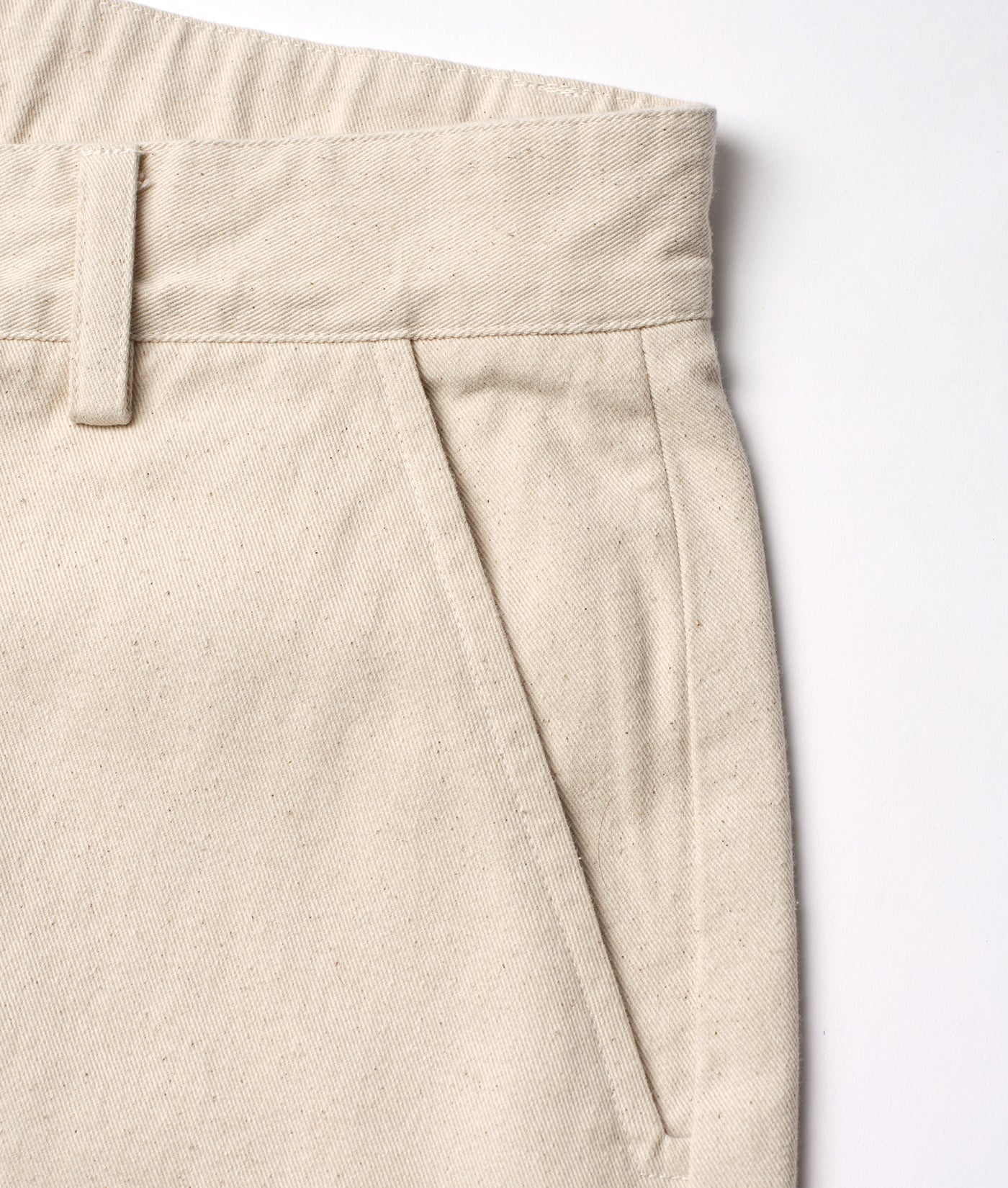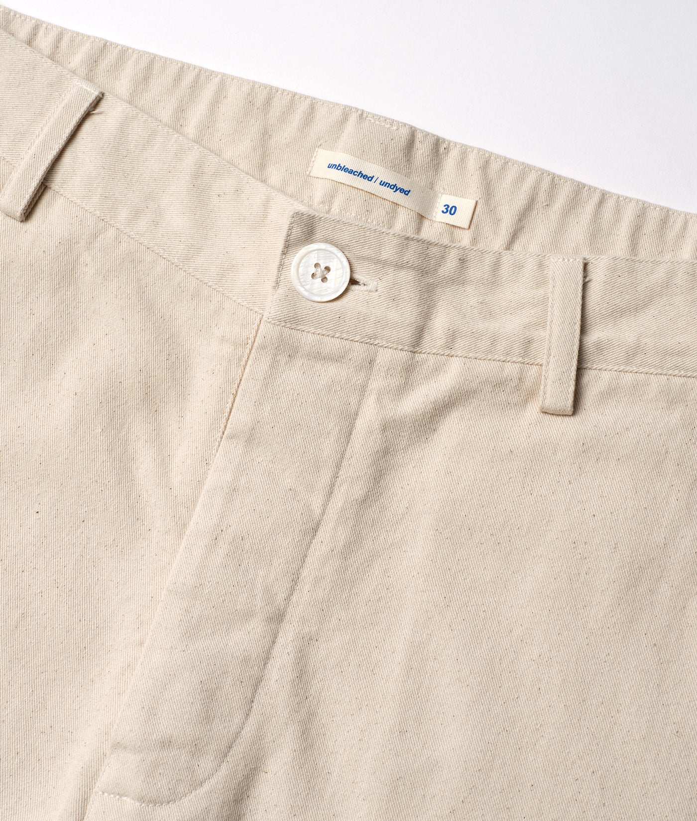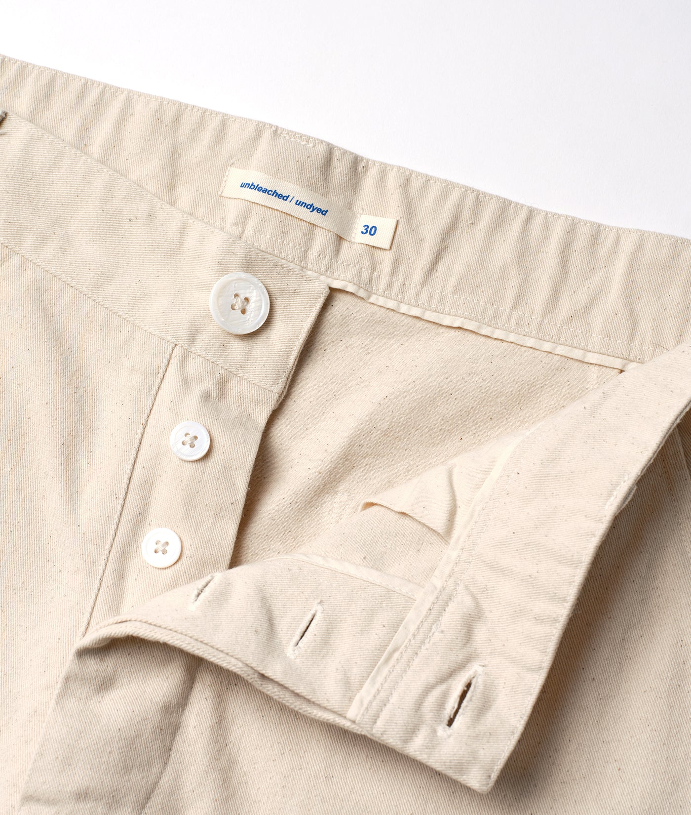 The Chinote Pants exemplify versatility and comfort, featuring a roomy seat, slightly tapered leg and distinctive river shell button fly. The premium cotton twill construction ensures superior breathability and during warmer temperatures. These trousers represent a modern and clean approach quality manufacturing practices and require the minimum amount of processes to create. Made at the source of the raw materials in Tamil Nadu, India.