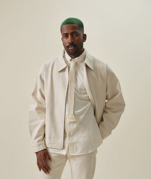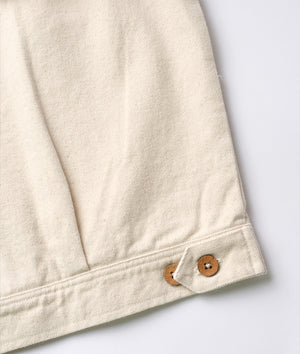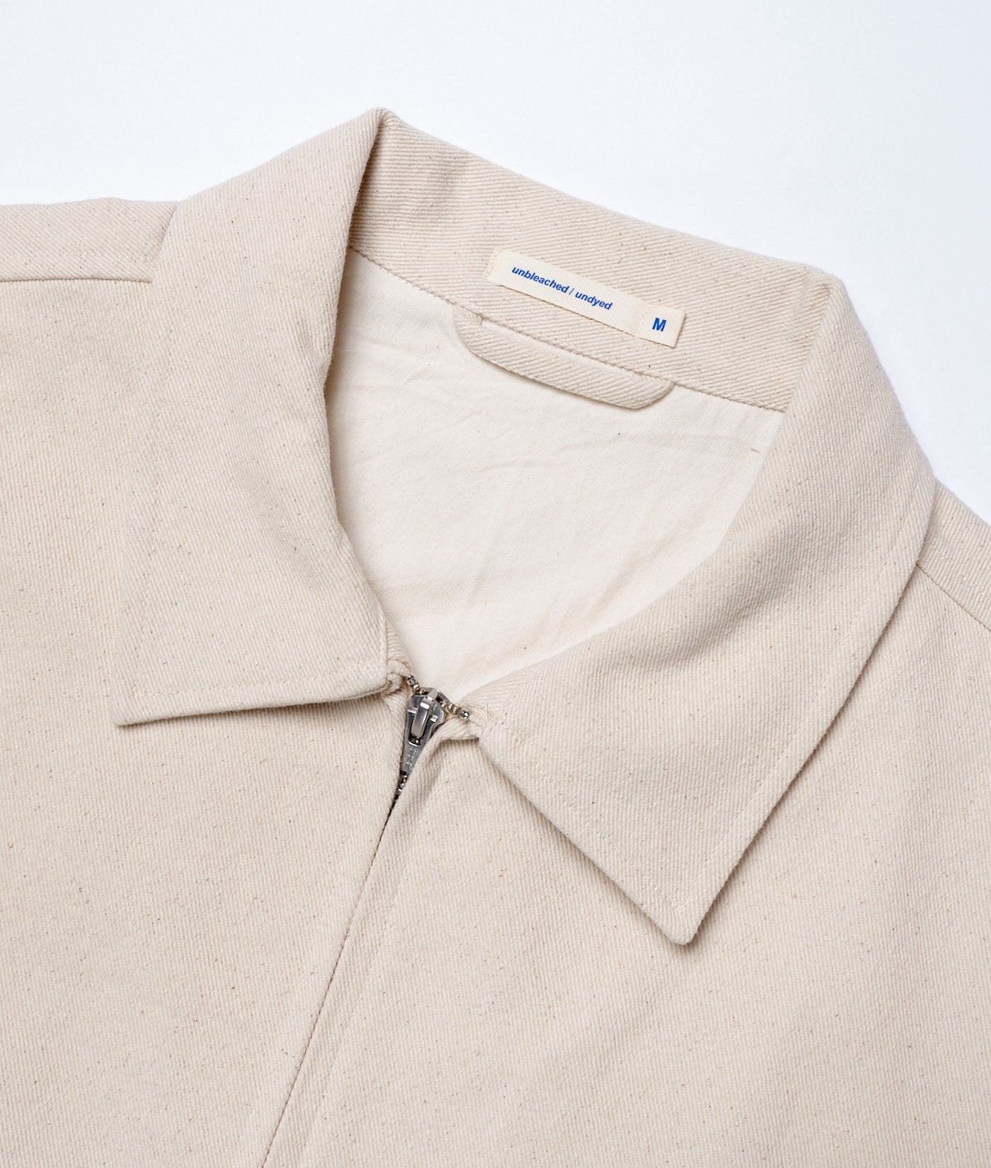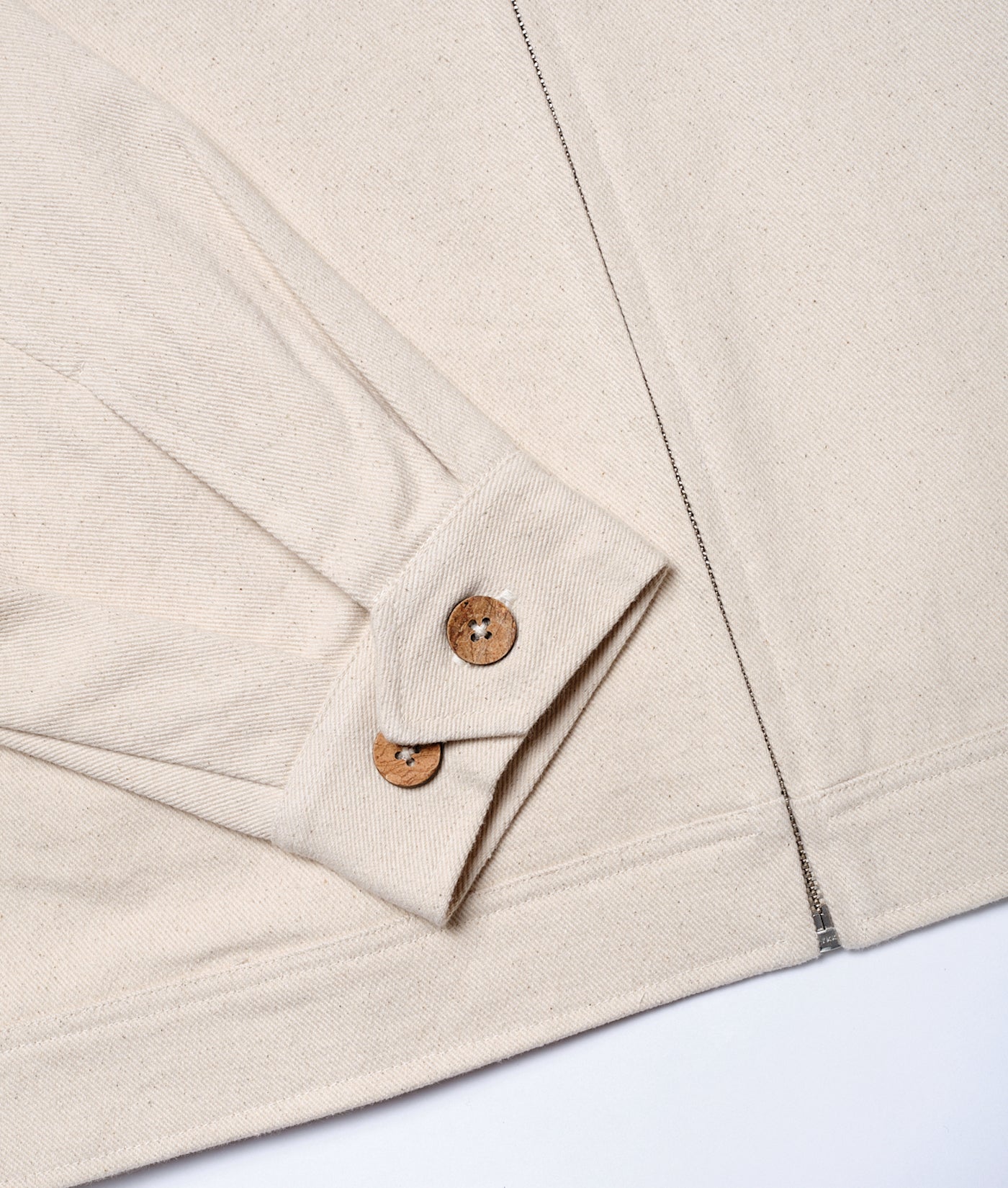 A beige cotton twill zip-up jacket hanging on a hanger, with coconut shell buttons visible.