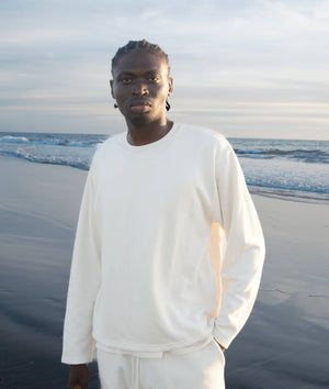 This medium-weight sweatshirt is made in Tamil Nadu, India using local 100% organic cotton. This sweatshirt has a boxy cut, an ultra- soft fleece finish inside and side slits that allow for a full range of motion.