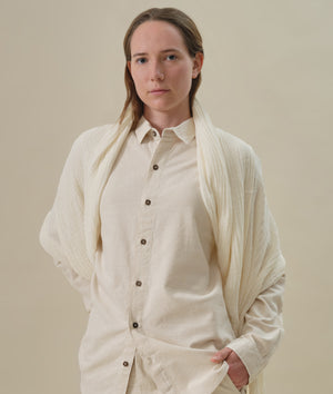 This lightweight organic cotton scarf is unbleached and undyed, allowing the natural qualities of the material to be appreciated for what they are.