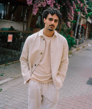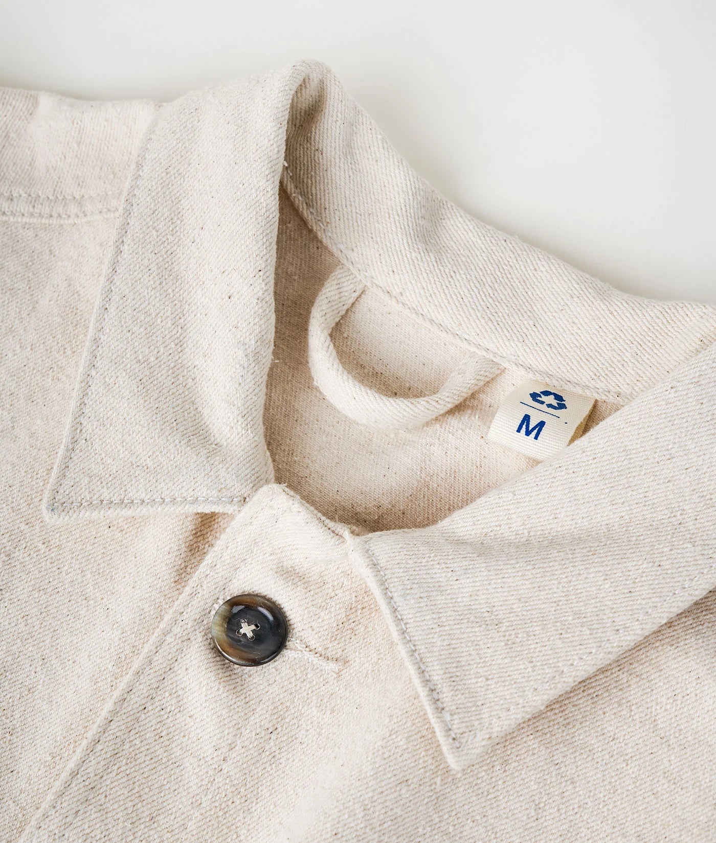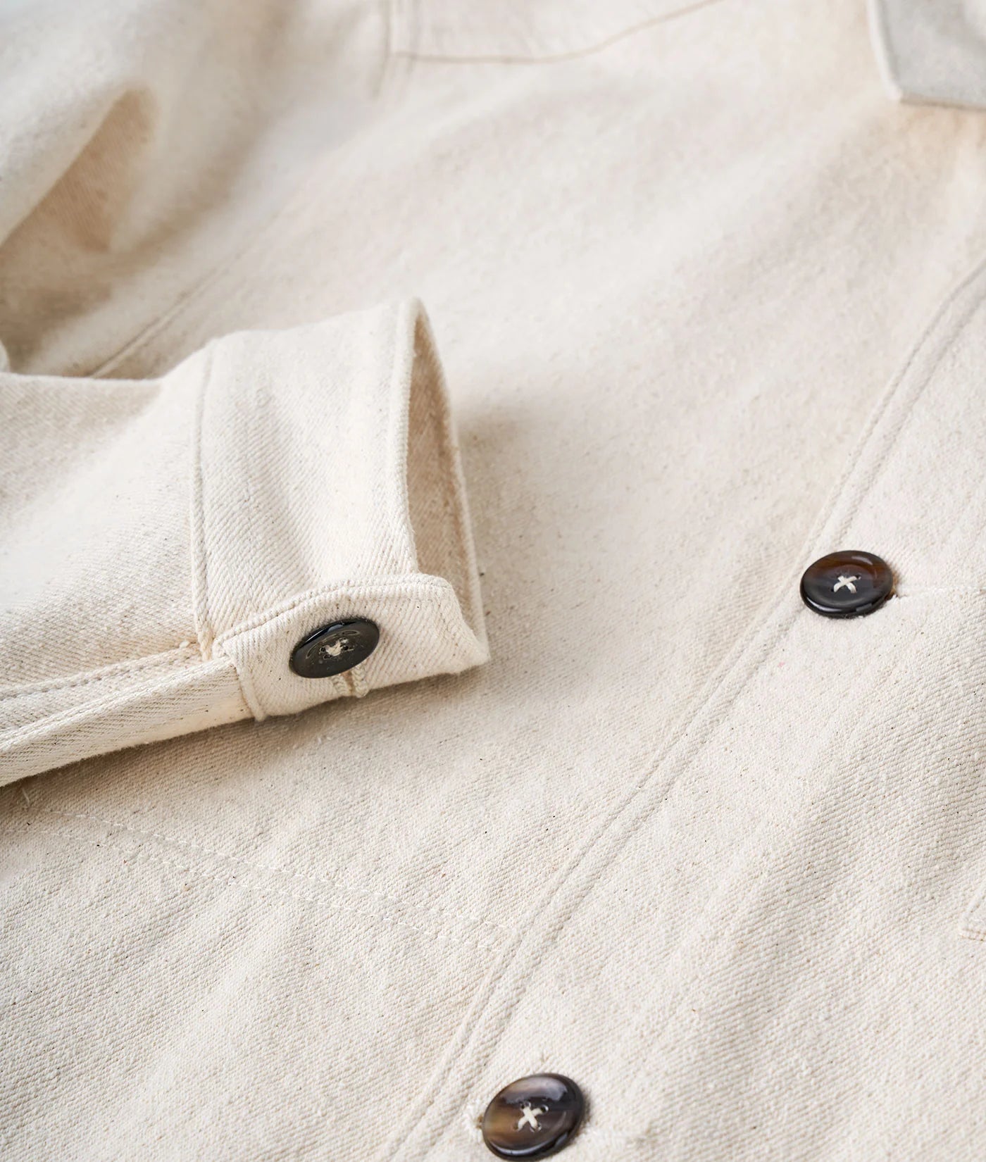 This jacket sits somewhere between a chore coat and a field jacket and has multiple functional pockets. It is finished with hand-carved horn buttons, crafted from by-product waste. Each button is naturally unique in color and pattern—no two are alike—imbuing every jacket with its own distinct character. This thoughtful detail not only honors the integrity of natural materials but also ensures the garment is fully biodegradable at the end of its life cycle.