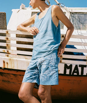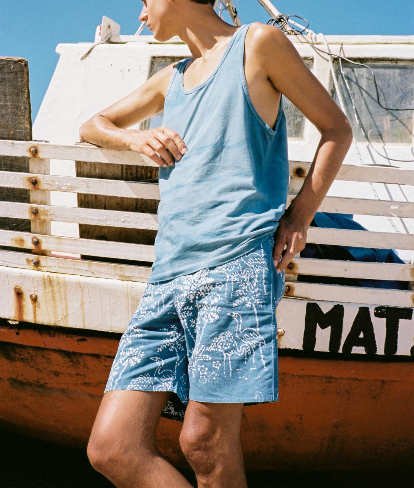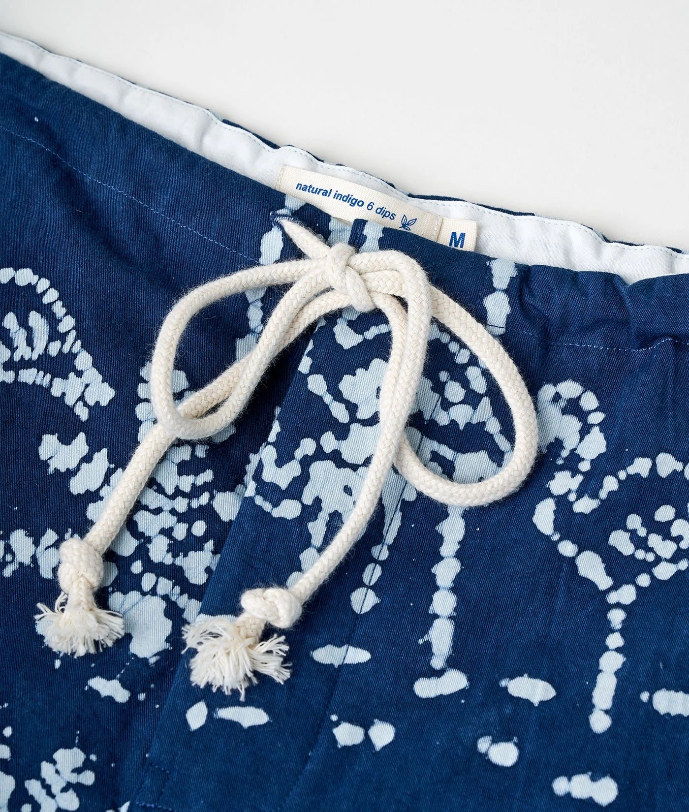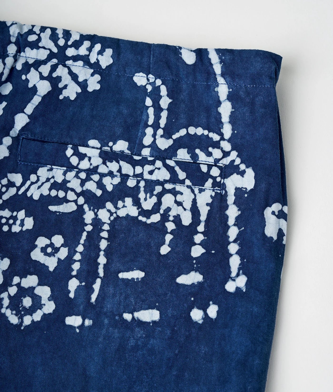 These boardshorts have been first stamped using a unique woodblock with nails covered in hot wax, then dipped 6 times in a fermented natural indigo dye vat to achieve a bright indigo color, and finally washed in hot water to reveal the design left by the wax’s resistance. This natural wax-resist printing process is called “Batik” and is clean for the makers, our skin and sustainable for the environment. A flamingo print makes a playful update to the IOAN Boardshorts made from 100% organic cotton in Tamil Nadu, India designed with a straight-cut fit.