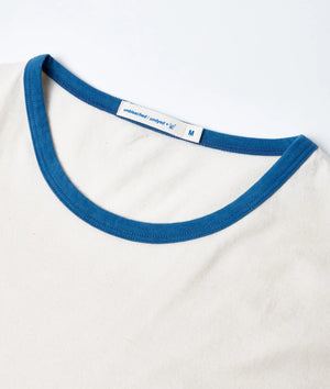 This IOAN essential is a modern take on the classic ringer t-shirt. The neckline has been dipped 6 times in a fermented natural indigo dye vat to achieve a vibrant indigo color, while the rest of the garment is completely unbleached & undyed.