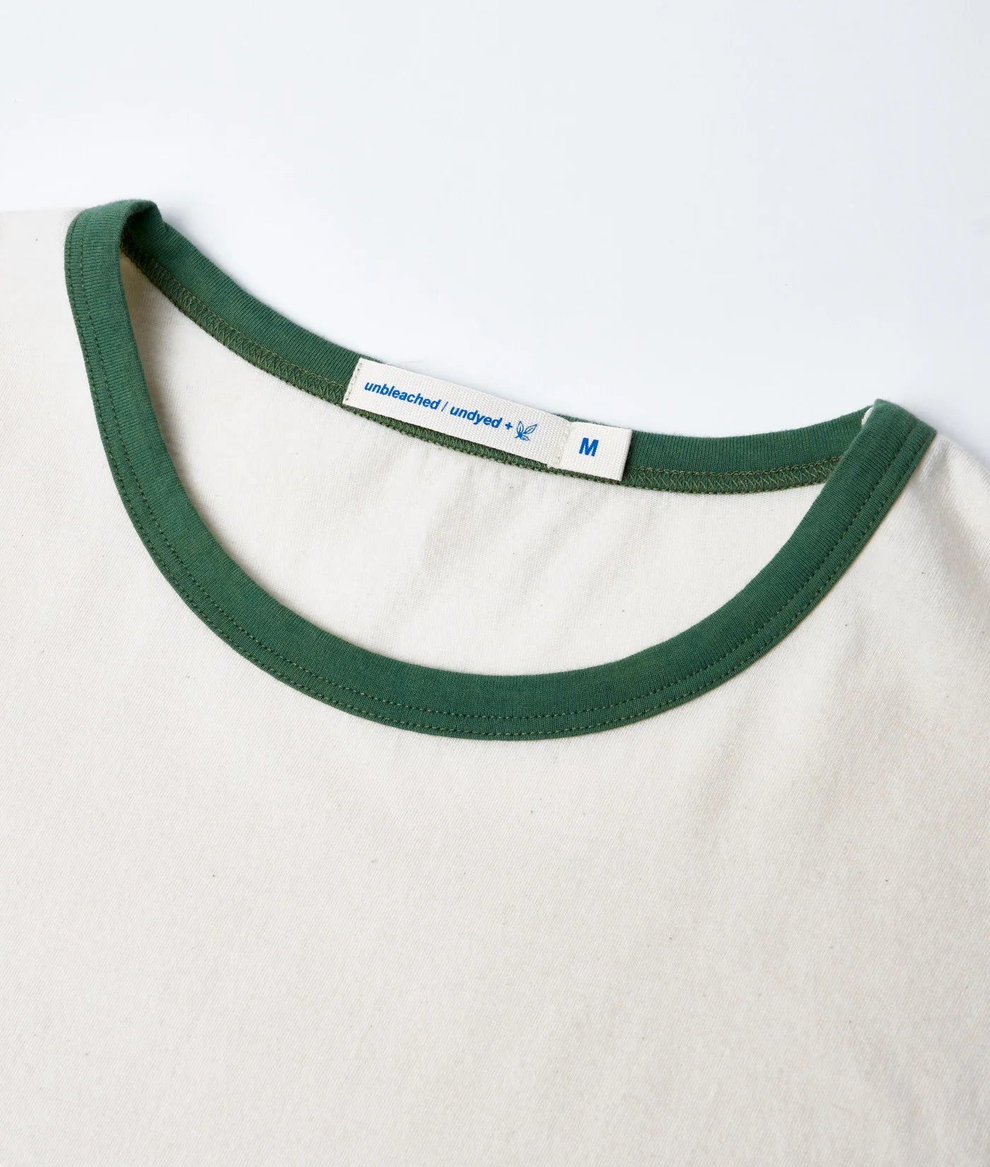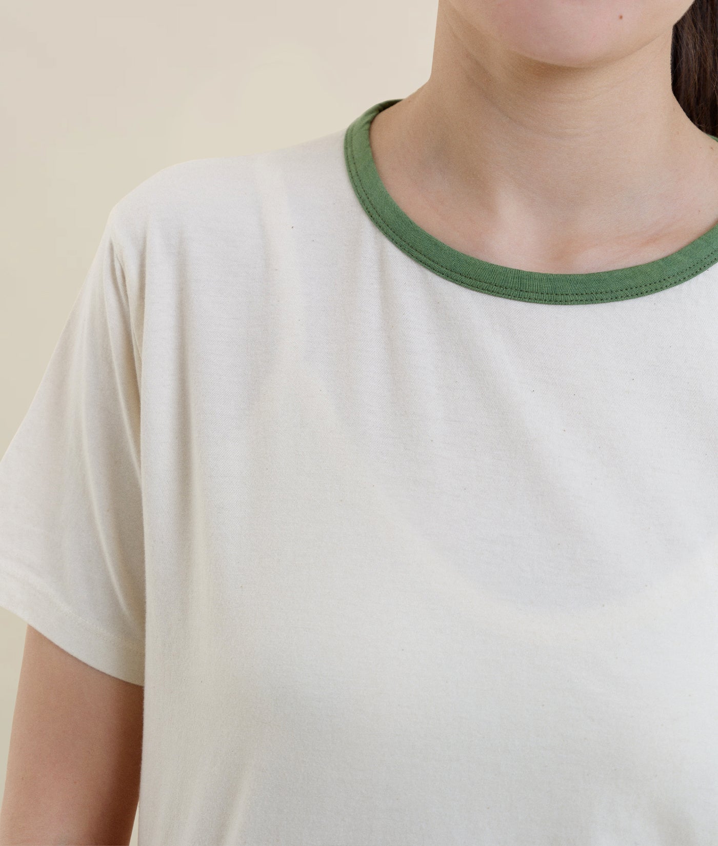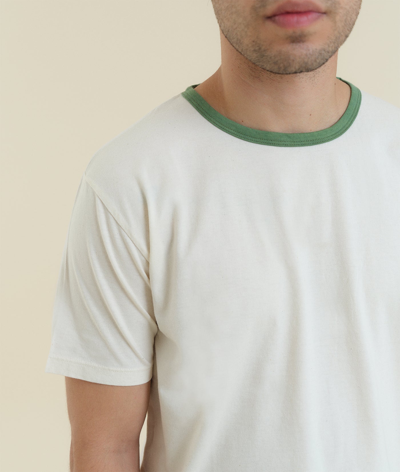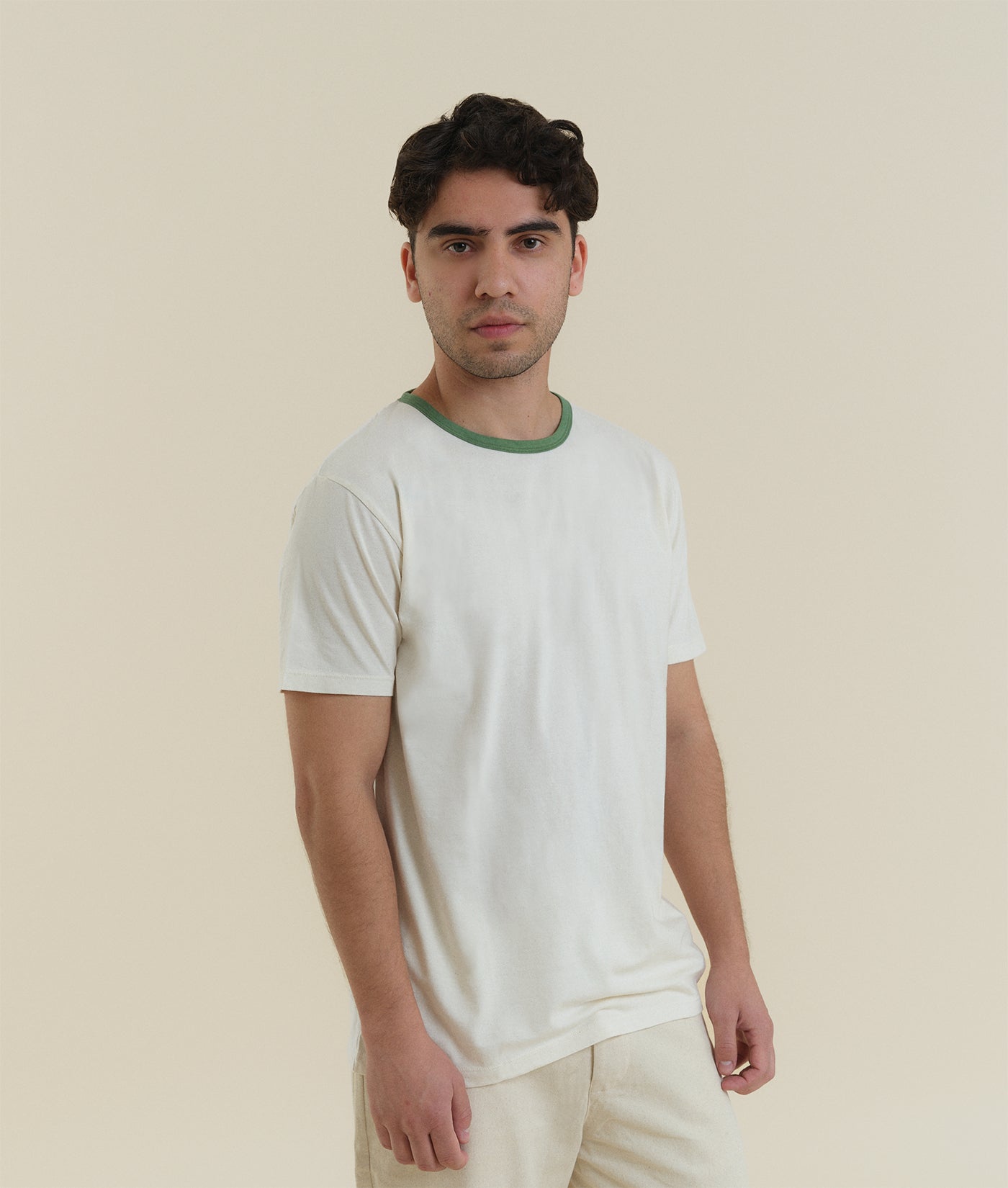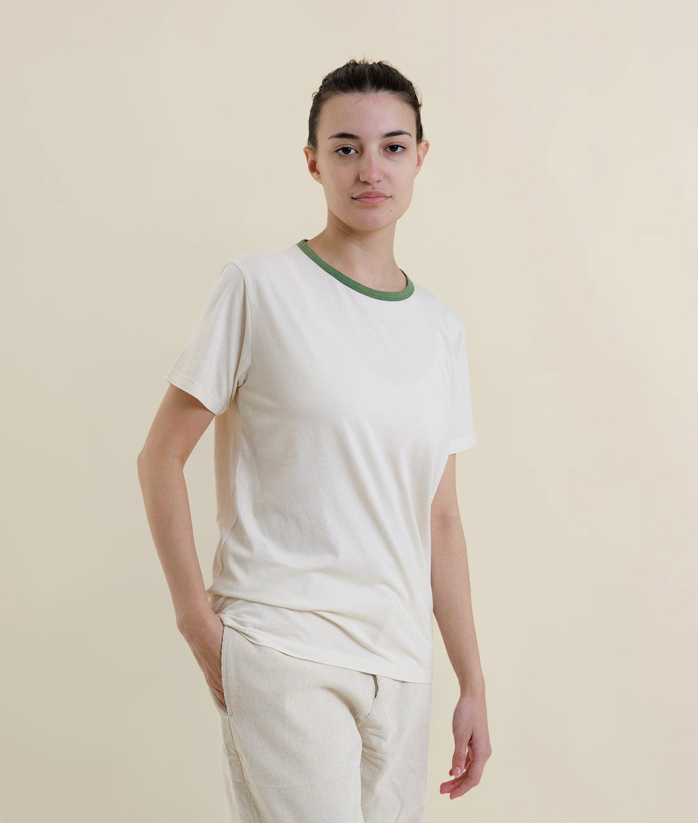 This IOAN essential is a modern take on the classic ringer t-shirt. The neckline has been dipped in both indigo and chebula seed natural dye vats to achieve a rich green color, while the rest of the garment is completely unbleached & undyed. Simple and easy to wear, the IOAN Sport Crewneck T-shirt is made from 100% organic cotton and locally manufactured in Tamil Nadu, India.