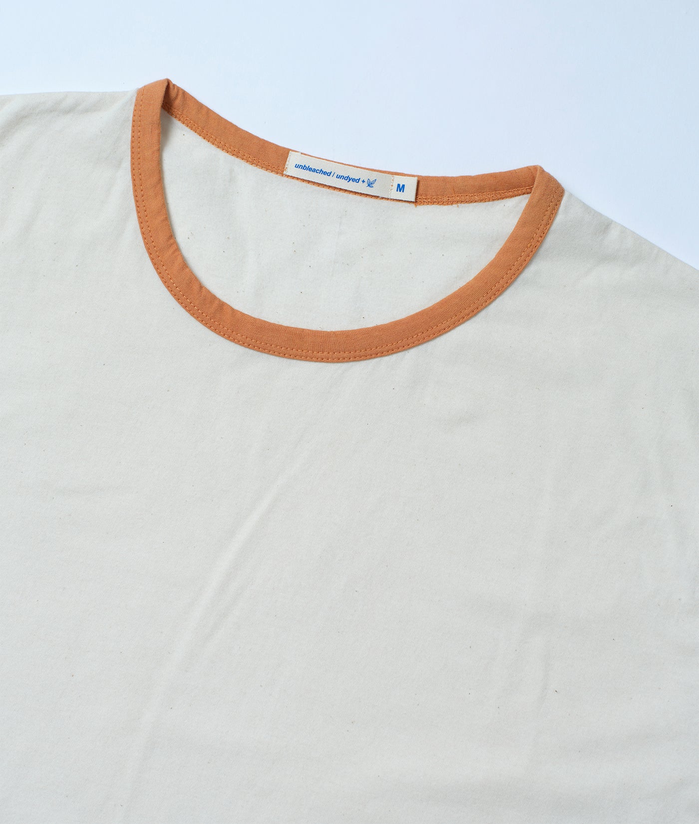 This IOAN essential is a modern take on the classic ringer t-shirt. The neckline has been dipped in both rubia cordifolia and chebula seed natural dye vats to achieve a red-orange color, while the rest of the garment is completely unbleached & undyed. Simple and easy to wear, the IOAN Sport Crewneck T-shirt is made from 100% organic cotton and locally manufactured in Tamil Nadu, India.