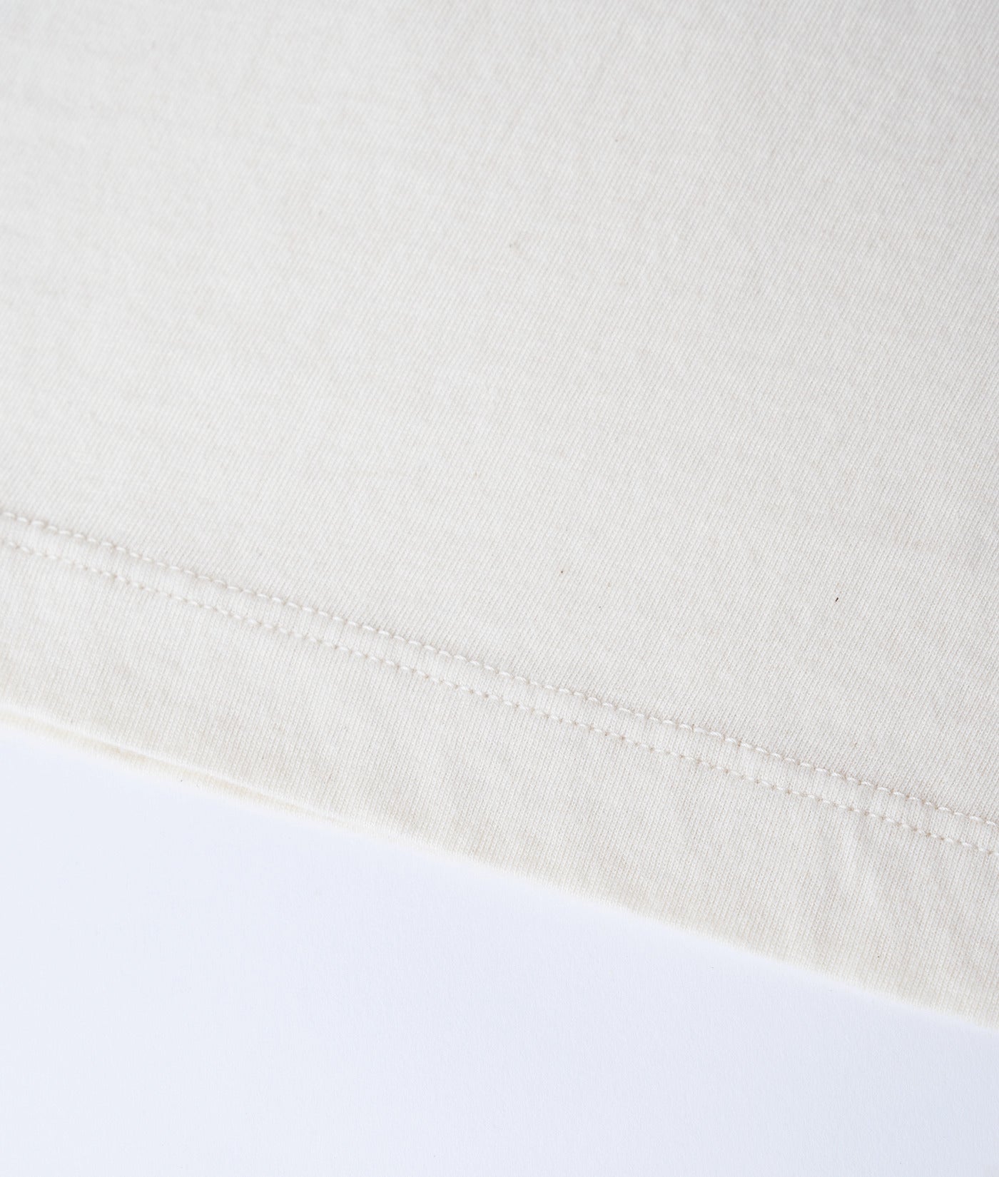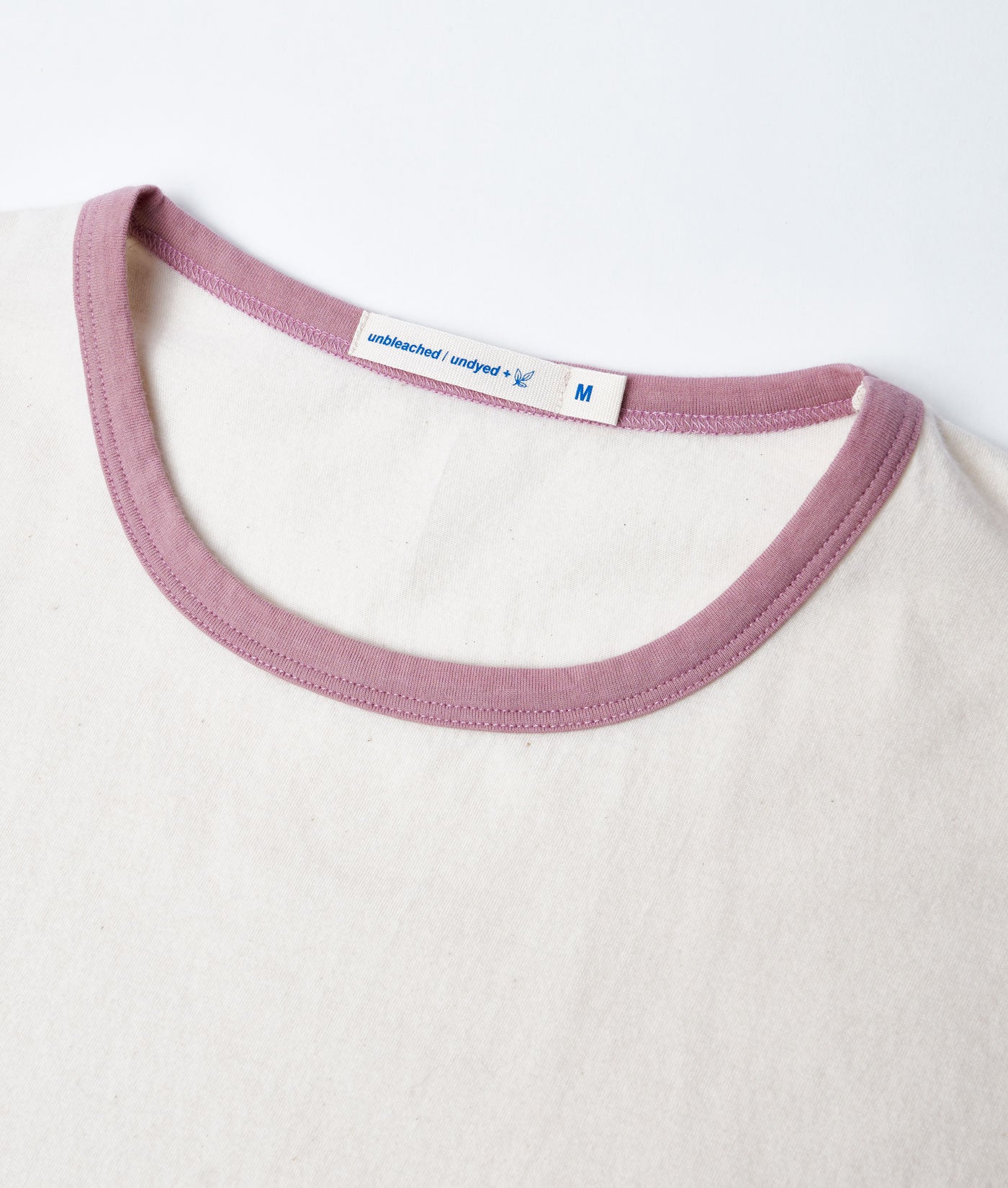 This IOAN essential is a modern take on the classic ringer t-shirt. The neckline has been dipped in a shellac beetle resin dye vat to achieve a pink-purple color, while the rest of the garment is completely unbleached & undyed.