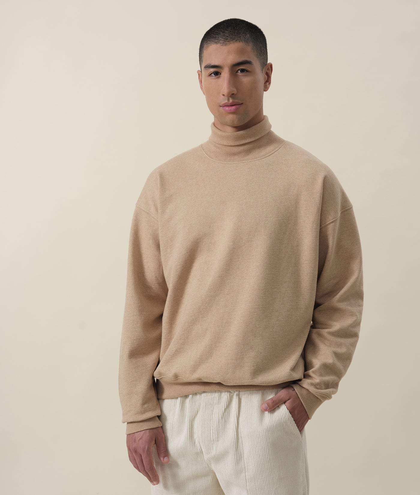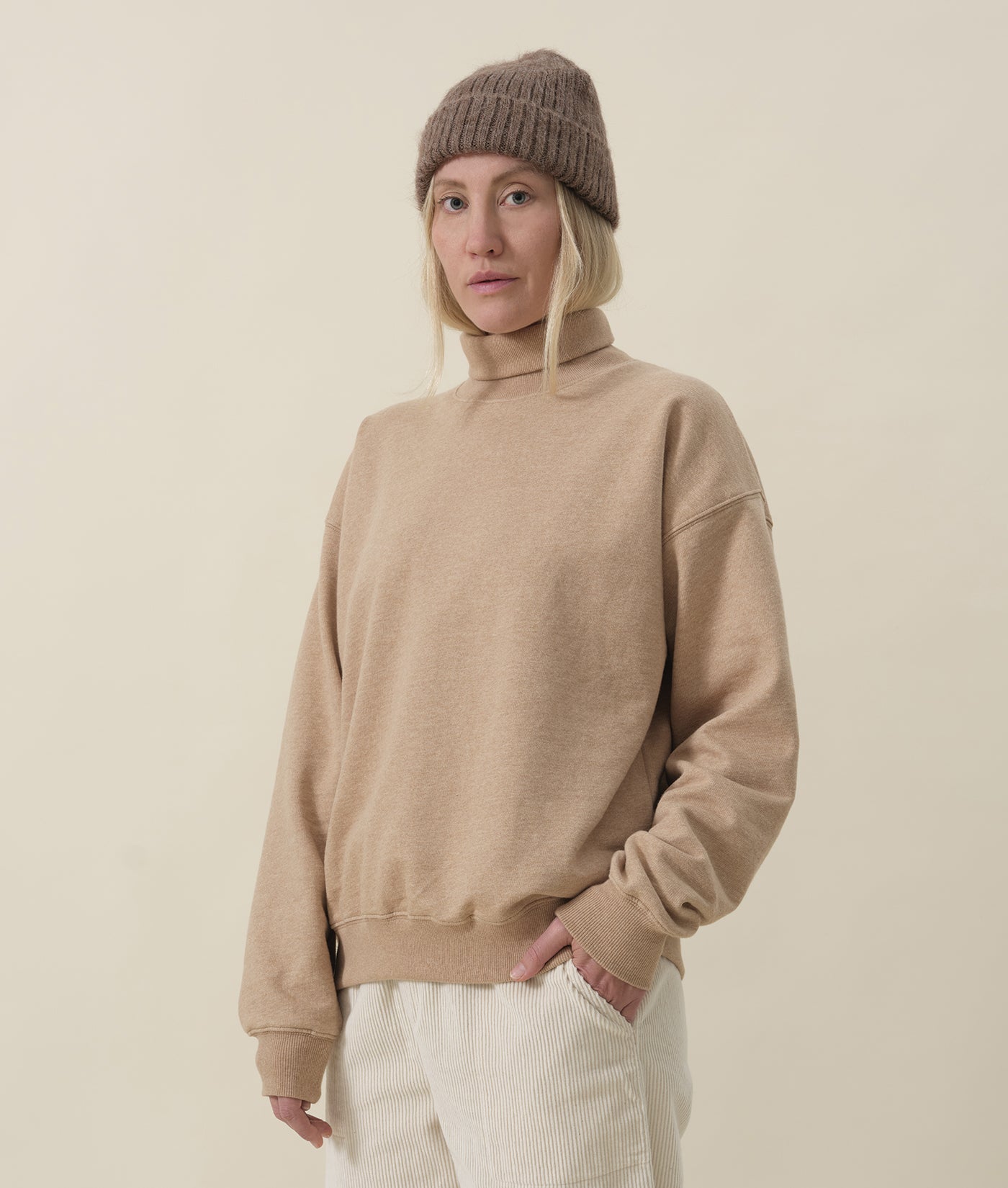 This 100% organic cotton turtleneck sweatshirt is made from naturally pigmented cotton, meaning the garment's color comes entirely from the fiber itself. The production process of this garment requires minimal water usage and does not involve any dyeing or harmful washes.