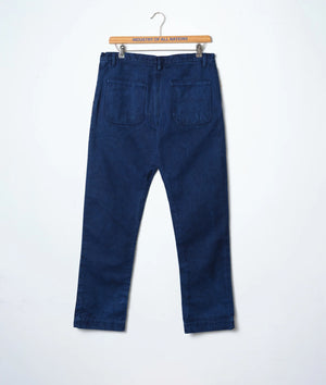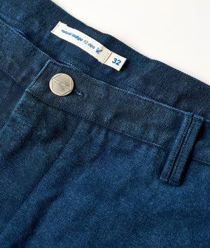 These heavyweight trousers have been dipped 12 times in a fermented natural indigo dye vat to achieve a deep indigo color. Each pair is made in Tamil Nadu, India using locally grown 100% organic cotton.