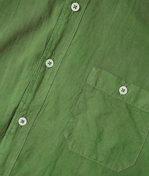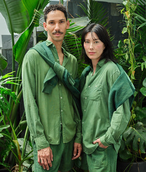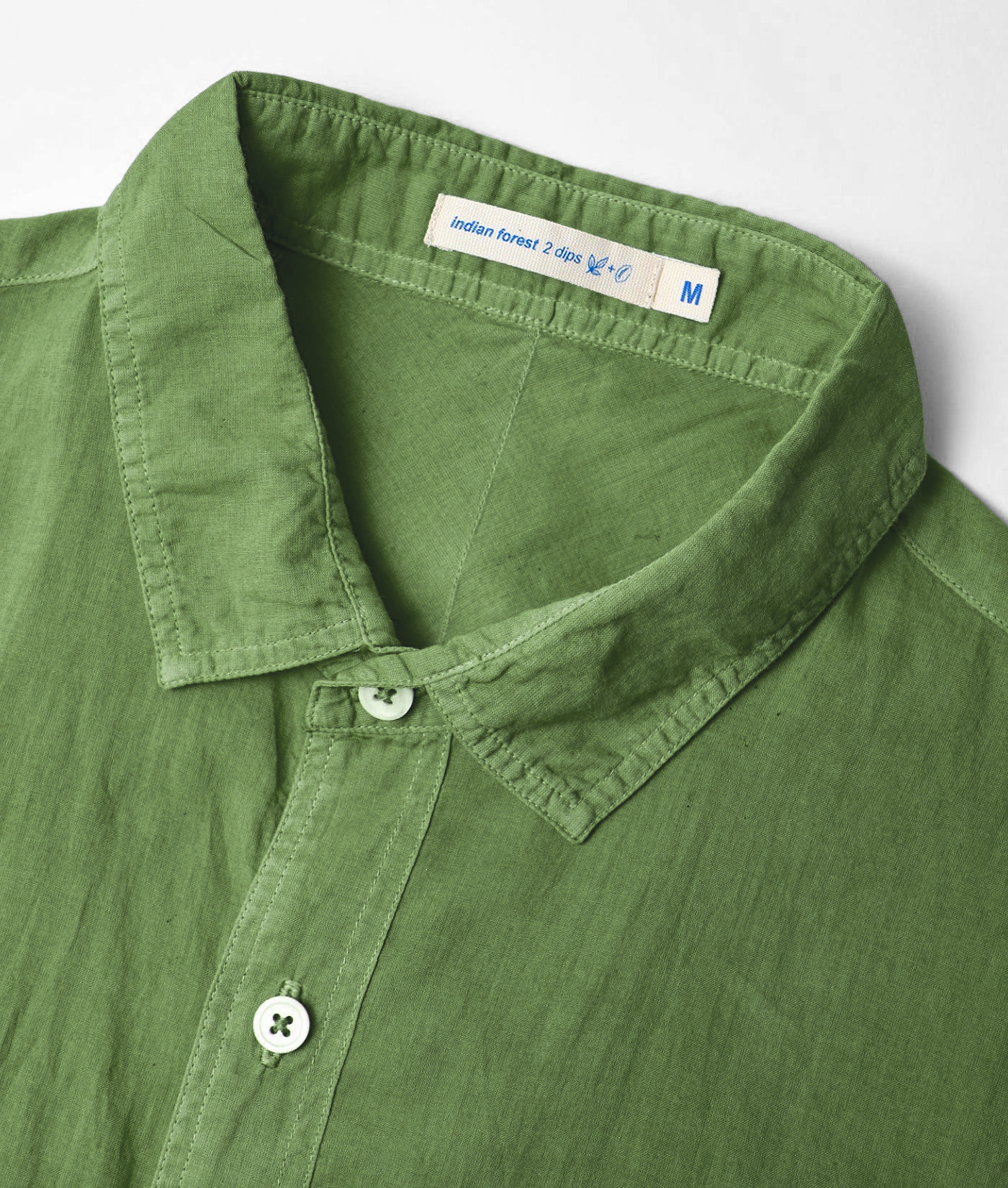 This shirt has been dipped in both a fermented natural indigo dye vat and a terminalia chebula seed dye bath to achieve a vibrant green color. The IOAN Madras long-sleeve button-down shirt is made from 100% organic cotton locally grown in Tamil Nadu, India. A classic style that is lightweight and perfect to wear for any occasion.