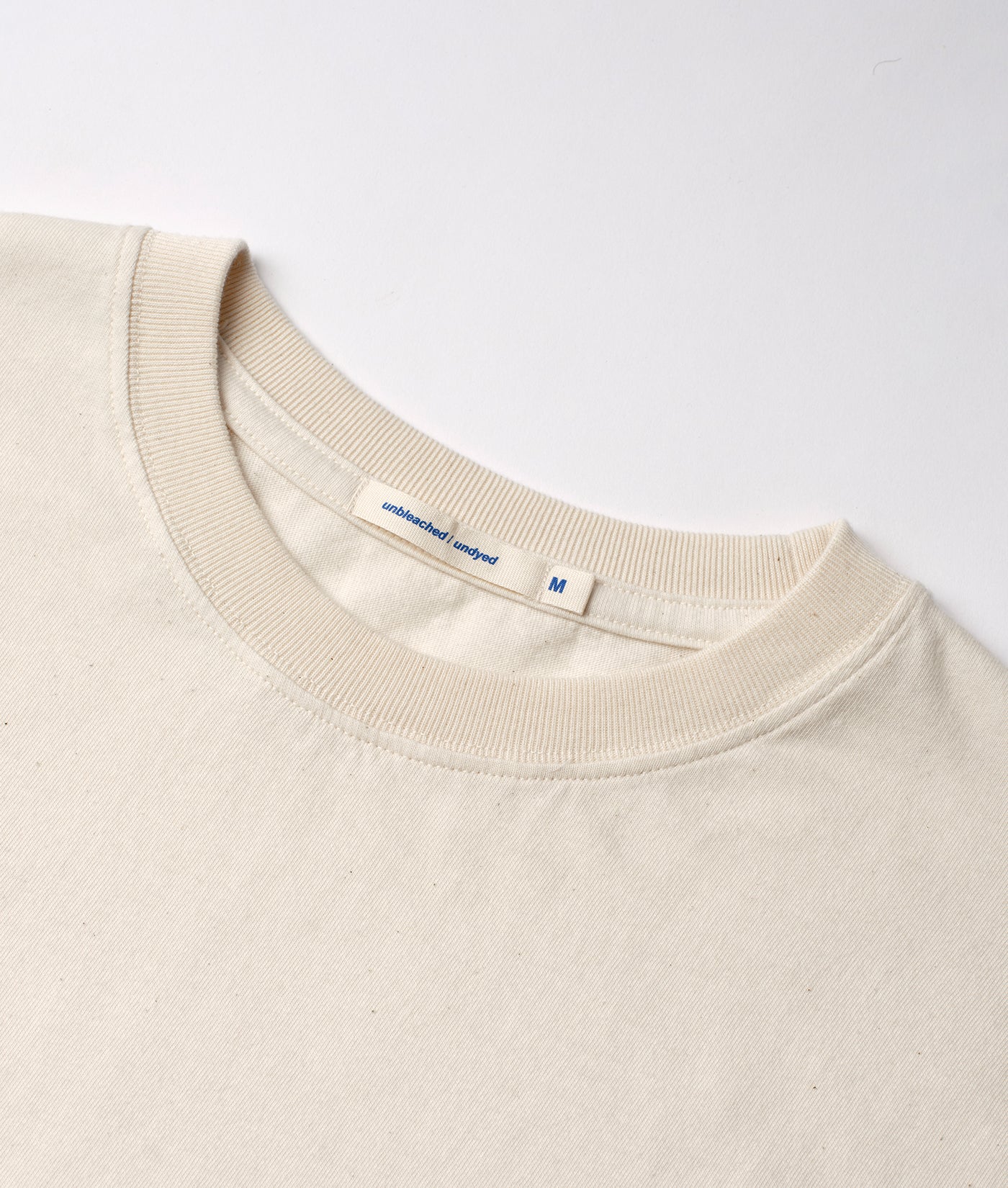 This essential piece is made from 100% organic cotton, cultivated on local farms in Tamil Nadu, India. The fabric is undyed and unbleached, meaning its inherent color derives entirely from the virgin cotton fibers, ensuring minimal resources usage.