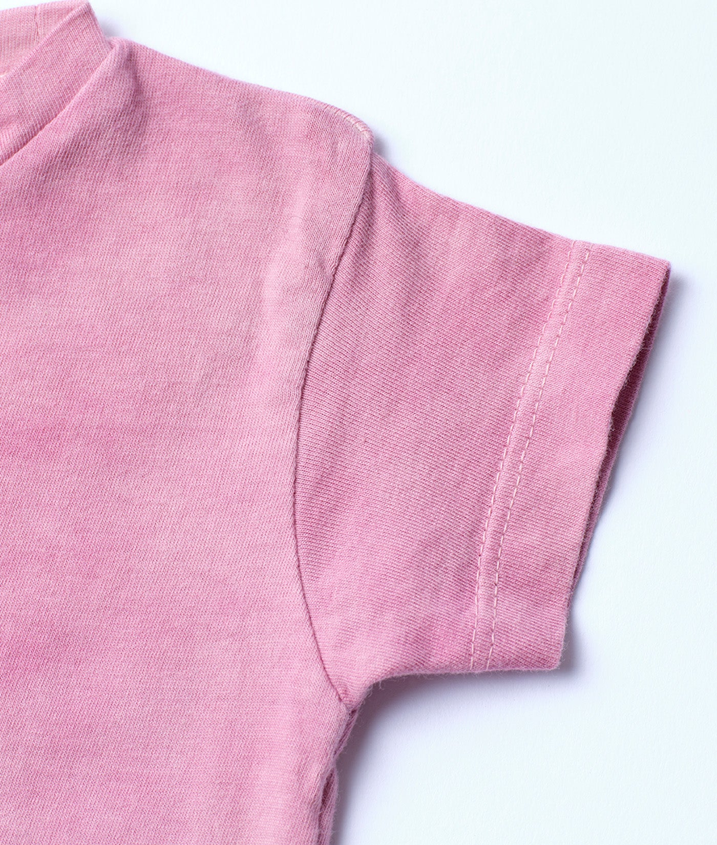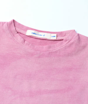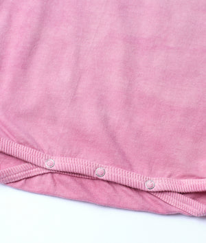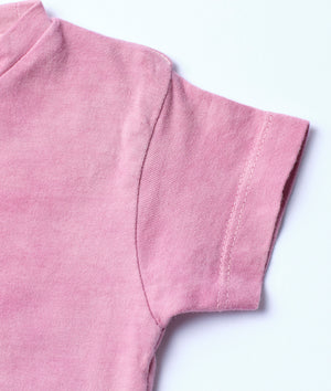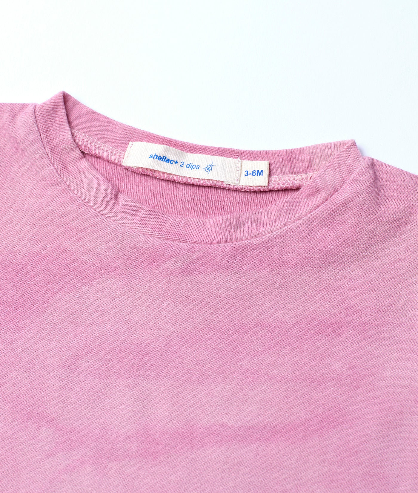This onesie has been dipped 2 times in a shellac beetle resin natural dye bath to achieve bright and varied pinkish-purple hues.