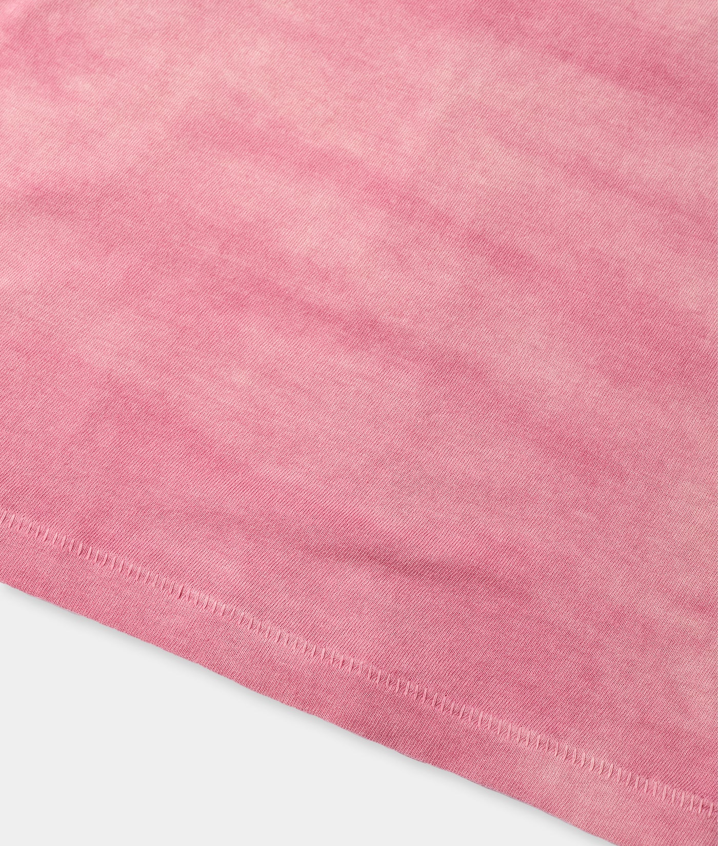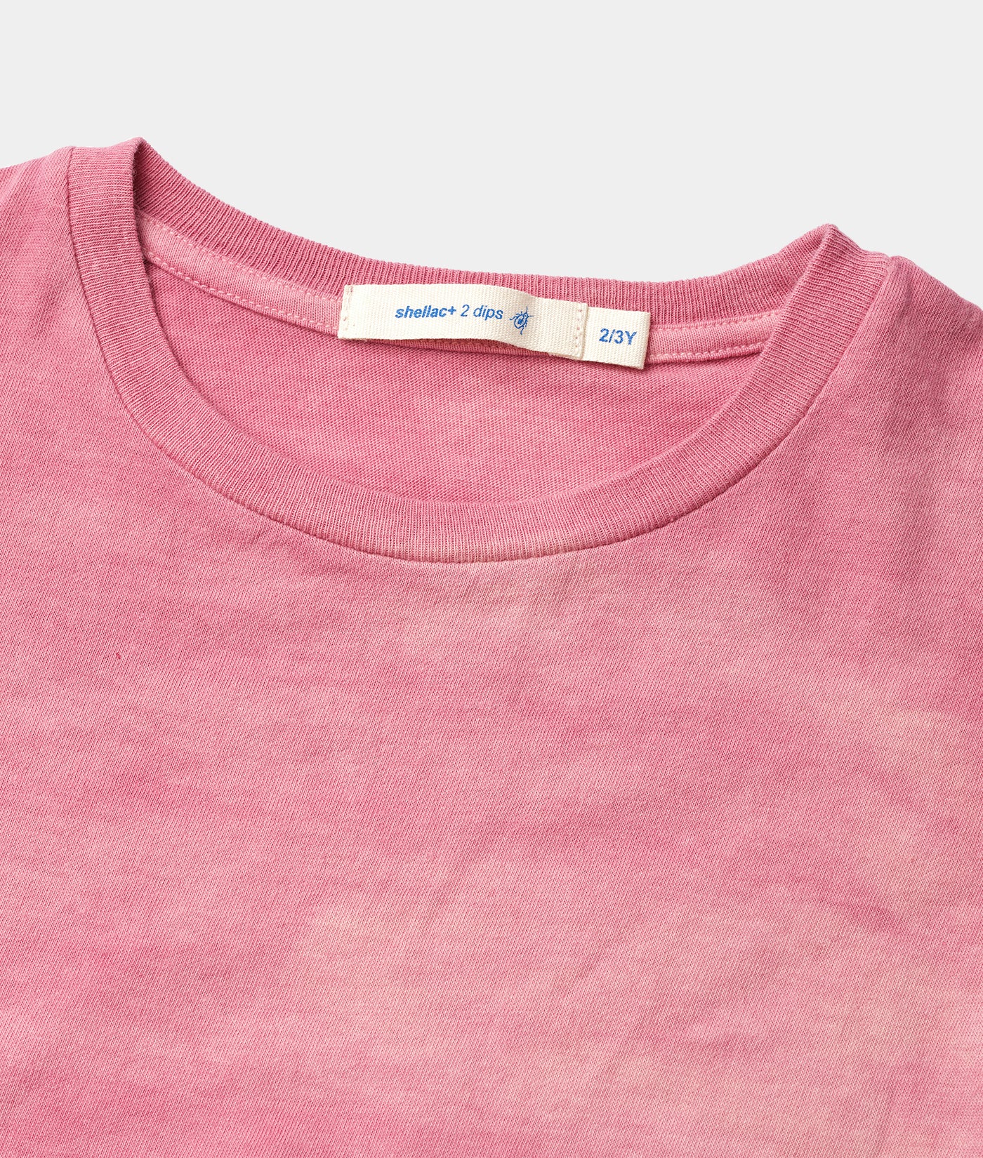 This t-shirt has been dipped 2 times in a shellac beetle resin natural dye vat to achieve a unique and varied pinkish-purple color.