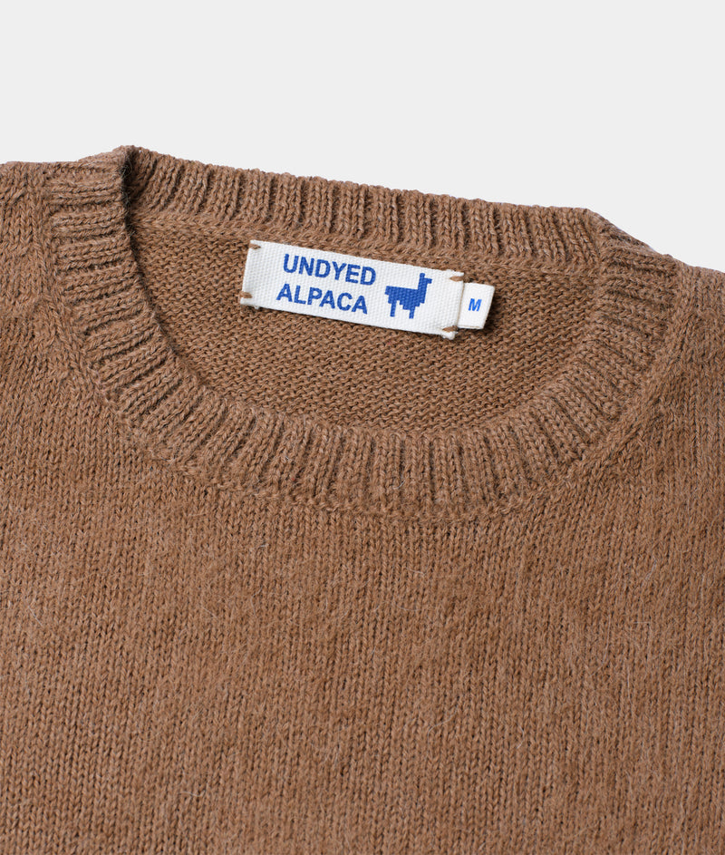 A brown alpaca fiber crewneck sweater hanging on a hanger against a white background.