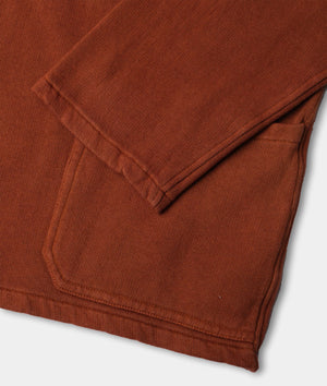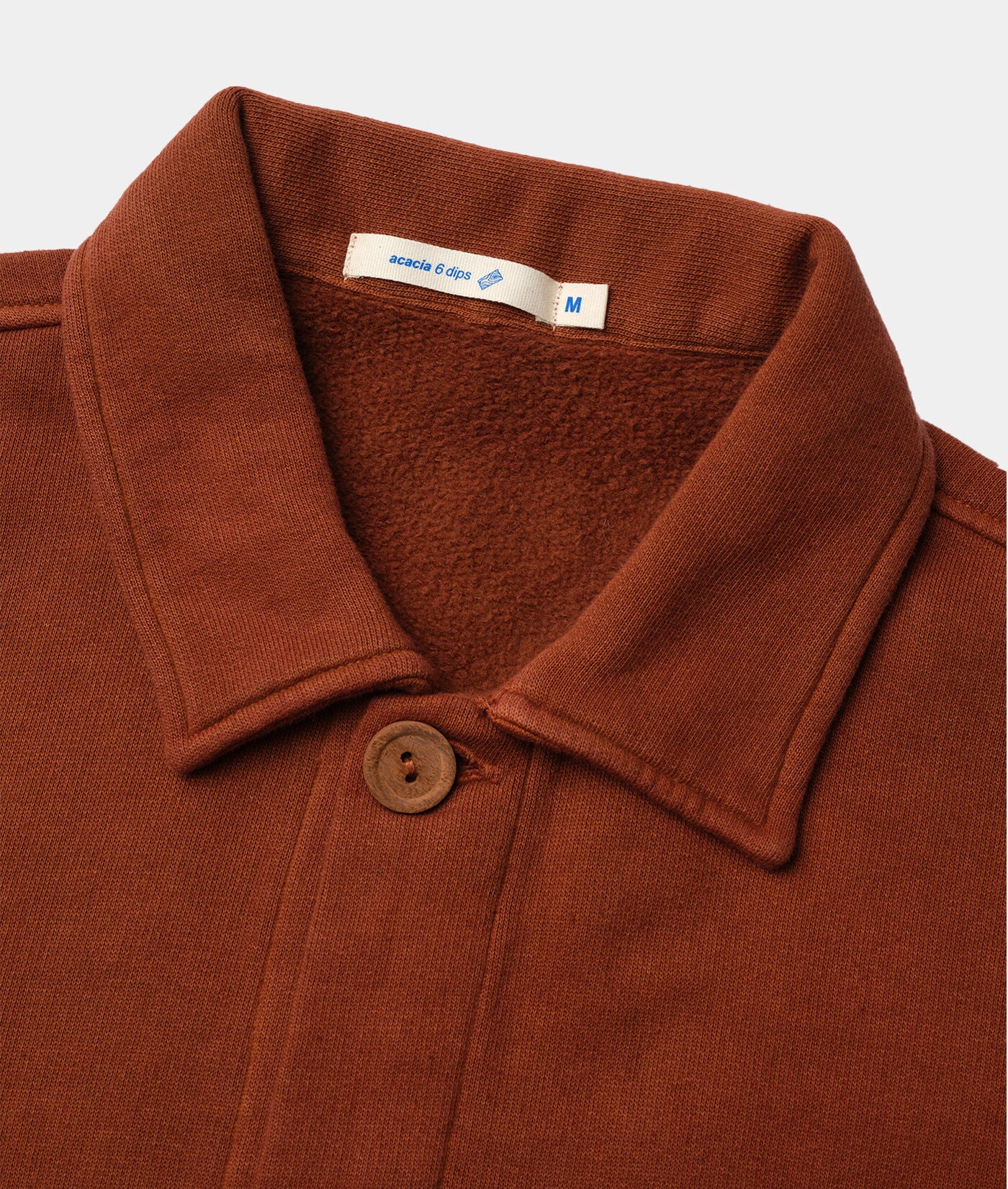 This sweatshirt jacket has been dipped in an acacia tree bark natural dye vat to achieve a rusty brown color. The IOAN Ponya Sweatshirt Jacket is made in Tamil Nadu, India using locally grown 100% organic cotton. Slightly cropped, easy to move around in, and finished with wooden buttons, this jacket is our soft, layer-friendly all season garment, featuring the same cut as our standard Ponya Jacket.