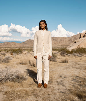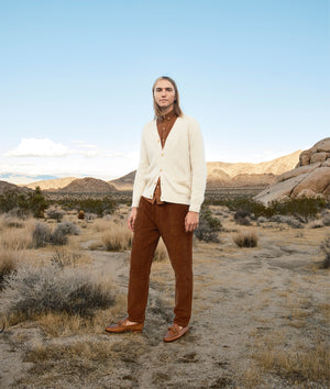 The IOAN Alpaca Cardigan is made from 100% alpaca fiber by a Bolivian co-op of farmers, manufacturers, and knitters. This hypoallergenic sweater is finished with genuine horn buttons and knit in a classic cardigan fit. The production of this ultra soft, medium-weight cardigan sweater supports the local lifestyles, craftsmanship, and the future of this community. This garment is undyed and the color of the fibers comes completely from the superfine, natural hairs of the alpaca that are transformed into yarn for artisans to knit.