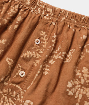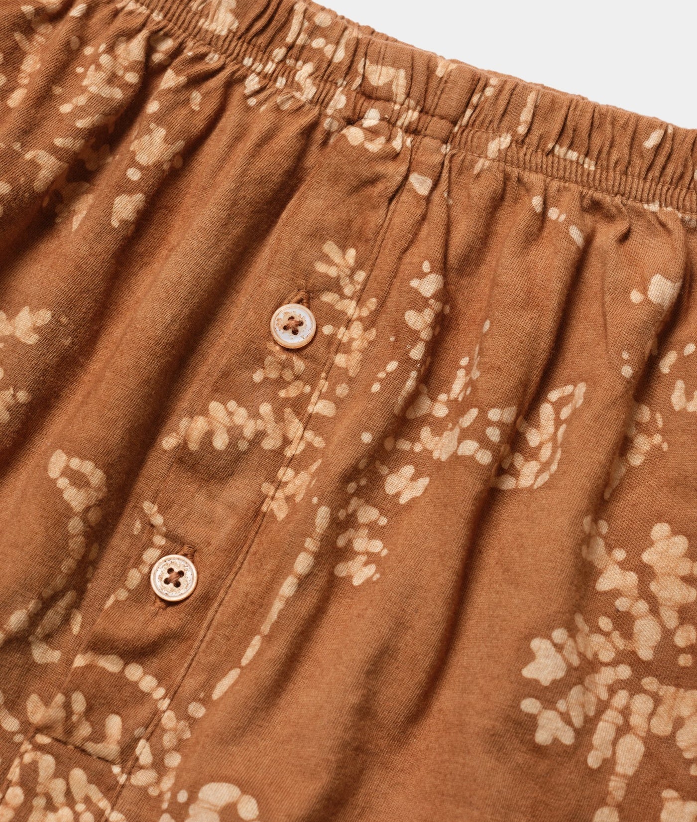 IOAN jersey boxers are made from 100% organic cotton in Tamil Nadu, India. Each pair is hand printed with a batik wax resist and naturally dyed in an acacia tree bark solution to achieve an earth brown color. Exceptionally soft and breathable, they featuring a form-fitting waistband made from recycled elastic, perfect for all body types. The fly buttons are carved from river shell and are fully functional.
