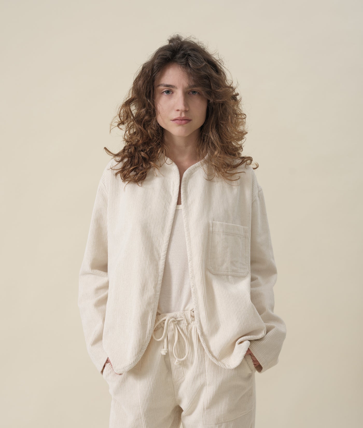 Ideal for transitioning seasons, this layering garment is made using sumptuous and soft 100% undyed organic cotton corduroy fabric. Unbleached and naturally off-white, this jacket showcases the pure color derived from the virgin fibers of its raw material. The IOAN Nube Corduroy Jacket is locally sourced in Tamil Nadu, India.