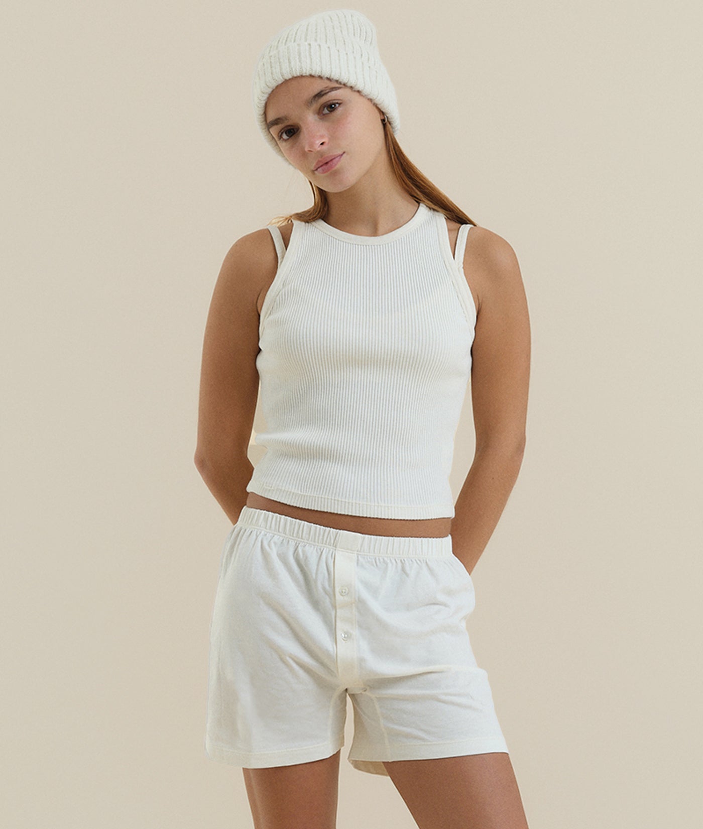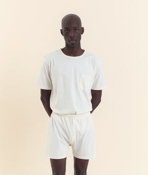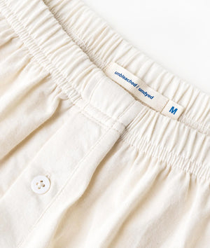 These jersey boxer shorts are made from 100% unbleached and undyed organic cotton in Tamil Nadu, India. This pair of underwear is exceptionally soft and breathable, featuring a form-fitting waistband made from recycled elastic, perfect for all body types. The fly buttons are carved from river shell and are fully functional.